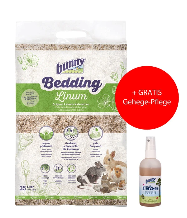 Sie sind auf der Suche nach einer zuverlässigen Einstreu für Ihr geliebtes Kaninchen oder Nagetier? Dann könnte Sie die Naturstreu Bedding Linum von bunny® NATURE interessieren. Dieses hochwertige Produkt aus nachhaltigen Leinen ist äußert sparsam im Verbrauch und sowohl für Kaninchen und Hamster als auch für Mäuse, Ratten und Frettchen geeignet. Das Beste: zusätzlich erhalten Sie das gratis Gehege-Spray Alles Klärchen. Überzeugen Sie sich selbst von dieser idealen Kombination.