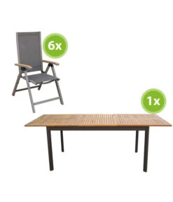 Das Gartenmöbelset Colmar 1 bietet Ihnen dank des stabilen und optisch zeitlosen Aluminium-Gestells eine sehr lange Lebensdauer, sodass Sie hiermit Ihr Geld gut und sinnvoll investiert haben. Zu den verarbeiteten Materialien zählt auch qualitativ hochwertiges, mit FSC®-zertifiziertes Teakholz, das nicht nur besonders widerstandsfähig ist, sondern obendrein auch noch schick aussieht. Die sechs enthaltenen Stühle sind zusammenklappbar und somit besonders platzsparend zu verstauen, und der elegante Tisch ist auf variable Längen ausziehbar – so finden genug Personen Platz, um eine schöne und ausgelassene Zeit zu verbringen. Mit dem Gartenmöbelset Colmar 1 entscheiden Sie sich für gute Qualität und gesellige Stunden mit Ihren Liebsten im Freien. Greifen Sie zu.