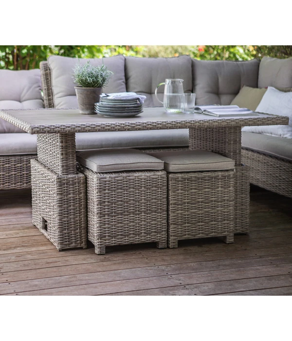 Es gibt Einladungen, denen man einfach nicht widerstehen kann. Und in diesem Fall müssen Sie es auch gar nicht. Denn, wenn erst einmal eine Dehner Geflechtlounge Bologna bei Ihnen auf der Terrasse steht, sollten Sie sich das gönnen so oft Sie nur können! Sinken Sie in die bequemen Polster, legen Sie die Füße hoch und blicken Sie mal in die eine, mal in die andere Richtung in Ihrer grünen Oase. Denn Sie sind jetzt der stolze Besitzer einer großzügigen Outdoor-Lounge, die wirklich keine Wünsche offenlässt. Das gilt bei 7 Sitzplätzen natürlich auch für gesellige Runden, die so gemütlich sein werden, dass Ihre Gäste gar nicht wieder aufstehen wollen. Eine Tatsache, zu der der attraktive Tisch einen gehörigen Teil beiträgt. Schließlich bietet er ausreichend Fläche für Ihren Sommerkuchen, das Kaffeegeschirr und einen üppigen Blumenstrauß. Oder Sie lassen es sich abends bei einer Familienrunde zum Grillen gutgehen. Kurzum: Sobald Sie die Dehner Geflechtlounge Bologna gesehen haben, können Sie sich Ihre Terrasse nicht mehr ohne sie vorstellen!