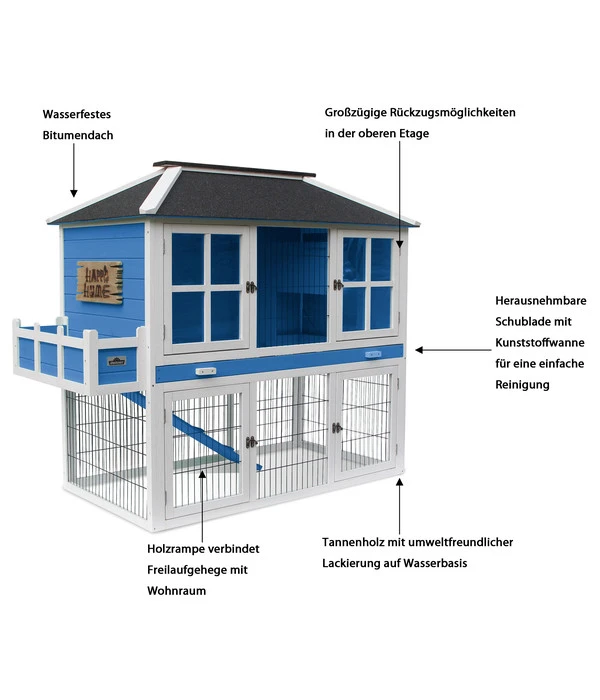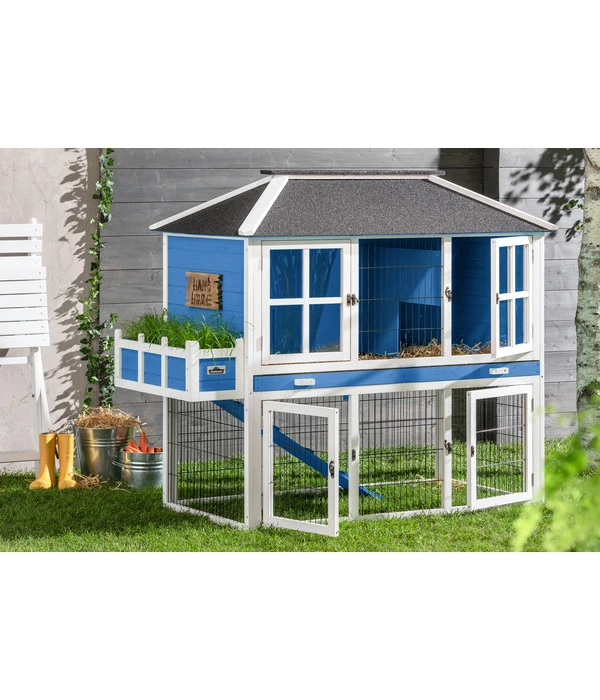 Wer Wert auf ein gepflegtes Zuhause legt und seinen Garten mit viel Liebe angelegt hat, wird auch beim Zuhause für die Kaninchen und Co nicht irgendeinen Stall wählen. Mit seinem blau-weißen Anstrich und den stilechten Sprossenfenstern bringt das Dehner Nagerheim Happy Home Palazzo einen frisch-maritimen Akzent in Ihren Garten, den Sie auch durch die individuelle Bepflanzung des Blumenkastens an der Seite unterstreichen können.