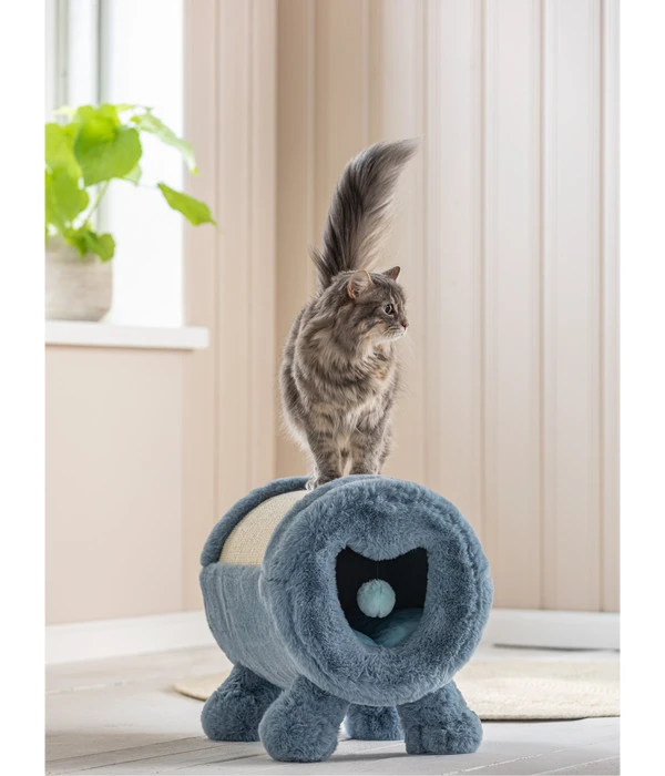 Am Eingang der Dehner Premium Lovely Kratzhöhle Kratzen & Kuscheln verlockt ein Plüschbällchen an einer Schnur dazu, es zu jagen. Begabte schaffen es, gemütlich ausgestreckt in der Höhle zu liegen, während die Arme mit den Krallen „auf die Jagd“ gehen.
