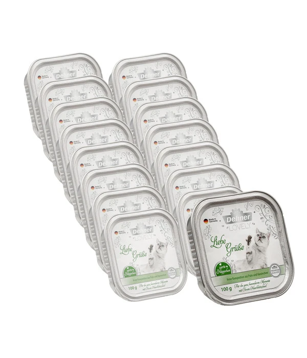 Könnten Sie Ihre Samtpfote fragen, was sie am liebsten frisst, würde die Antwort lauten: Fleisch. Und wäre Ihre Katze auf sich gestellt, stünden sicherlich hauptsächlich Mäuse und Co auf ihrem Speiseplan. Tag für Tag und Jahr für Jahr. Unsere Hauskatzen aber entwickeln sich meistens zu echten Feinschmeckern, so dass sich der Mensch ganz schön anstrengen muss, um seine anspruchsvolle Samtpfote kulinarisch zufriedenzustellen. Mit Dehner Premium Lovely Nassfutter Liebe Grüße aber ist uns eine ganz besondere Rezeptur gelungen, die den Wunsch Ihrer Katze nach viel Fleisch erfüllt und ihr zugleich ein ganz besonderes Genusserlebnis bietet. Denn zu den feinen Häppchen Pute hat der Koch auch leckeres Kaninchen kombiniert. Servieren Sie Ihrer geliebten Samtpfote bald das Dehner Premium Lovely Nassfutter Liebe Grüße und genießen Sie danach, wie sie sich wohlig schnurrend bei Ihnen dafür bedankt.