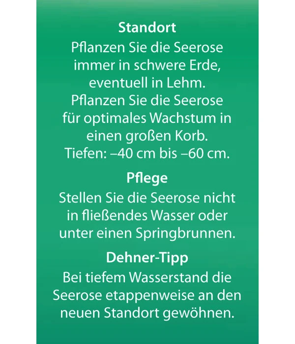 Die Seerose ‘Red Spider‘ gedeiht am besten in der Teichzone 5 (Wassertiefe 60 cm bis schwimmend), der Standort sollte außerdem mehrere Stunden pro Tag Sonne erhalten. Da die Seerose ‘Red Spider‘ von Dehner zu den stark wachsenden Seerosensorten zählt, sollten Sie sie unbedingt in einen Seerosenkorb pflanzen, damit sie sich über ihr Rhizom nicht unkontrolliert im Teich ausbreiten kann. Eigentlich brauchen Seerosen keine zusätzlichen Düngergaben, denn sie nehmen alle nötigen Nährstoffe aus dem Wasser und dem Boden. Manche Teichgärtner geben ihnen einen Langzeitdünger in Kügelchenform mit in den Pflanzkorb. Wichtig ist auch, abgestorbene Blätter und Blüten regelmäßig aus dem Wasser bzw. beim jährlichen Säubern des Teiches vom Grund zu entfernen. Alle 4 Jahre empfiehlt es sich, die Pflanzen herauszunehmen und zu teilen.
