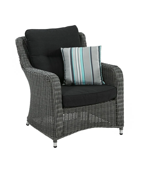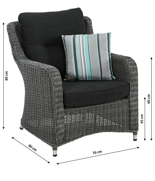 Ein hochwertiges Geflecht in Naturrattan-Optik, eine elegant beschwingte Form und erstklassiger Sitzkomfort – damit wird sich der Dehner Sessel ‘Toska‘ ganz schnell zu Ihrem neuen Stammplatz unter freiem Himmel entwickeln, an dem Sie am liebsten jede freie Minute verbringen würden. Von den ersten wärmenden Sonnenstrahlen im Frühling bis in den goldenen Herbst. Und was das Beste ist: Er kann als einladender Solist auf dem Balkon, der Terrasse oder im Wintergarten einen Platz finden, Sie können den Gartensessel aber auch mit dem Sofa aus der gleichnamigen Gartenmöbelserie kombinieren und eine größere Sitzgruppe bilden lassen. In jedem Fall wird Sie der Flechtsessel mit luxuriösem Sitzkomfort verwöhnen. Dafür sorgt neben der komfortabel großen Sitzfläche, der hohen Rückenlehne und den Armlehnen vor allem das dicke Sitz- und Rückenpolster. Das i-Tüpfelchen ist das modisch gestreifte Zierkissen, das auch einen frischen Farbtupfer auf die dunklen Polster setzt. Genießen Sie bald entspannte Stunden in Ihrem Dehner Sessel ‘Toska‘ – viele Jahre lang!