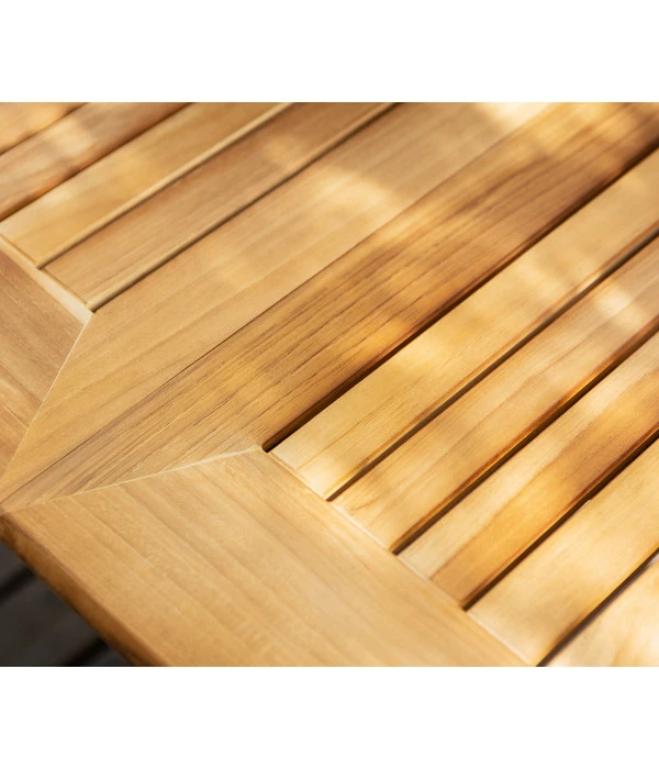 Für die elegante Optik sorgt beim Holztisch Colmar vor allem die Kombination aus dunklem Aluminium und warmem Teakholz. Doch neben dem ästhetischen Aspekt trumpfen beide Materialien auch mit ihrer hervorragenden Wetterfestigkeit auf. Das Gestell aus Aluminium wurde zusätzlich wetterfest beschichtet und das Teakholz der Tischplatte ist von Natur aus für ein langes Leben unter freiem Himmel eingestellt. Das ursprünglich in den Monsunwäldern Süd- und Südostasiens beheimatete Teakholz zeichnet sich durch eine enorme Härte und Widerstandfähigkeit gegen Witterungseinflüsse aus und ist sogar gegenüber Pilzen und Insekten erstaunlich resistent. Und noch eine Eigenschaft macht Teak für den Holztisch Colmar so attraktiv: Es ist außergewöhnlich formstabil und verzieht sich auch bei hoher Feuchtigkeit und Temperaturschwankungen nicht.