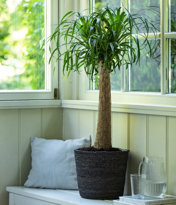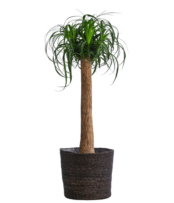 Bizarr, anmutig, exotisch – fallen auch Ihnen diese Begriffe ein, wenn Sie einen Elefantenfuß erblicken? Sie treffen auf jeden Fall auf dieses besondere Exemplar zu. Die beeindruckende Pflanze entstammt ursprünglich den tropischen Trockenwäldern Mexikos. Dort kann sie bisweilen Höhen von bis zu 10 m erreichen. Ihre besondere Ausstrahlung erhält sie durch ihren borkigen Stamm und die schmalen, leicht überhängenden Blätter, die mit der Zeit wie langes, wallendes Haar den Stamm umspielen. Letzterer erhält seine massive Form nicht nur aus Stabilitätsgründen, sondern vor allem, weil er darin Wasser speichert – ganz Sukkulente eben. Schmücken Sie also bald Ihr Wohn- oder Esszimmer mit diesem Elefantenfuß. Er ist ein unwiderstehlicher Blickfang, der angenehm langsam wächst, Ihren Blick wie magisch anziehen wird und der bereits in einem dekorativen Seegras-Korb zu Ihnen kommt!
