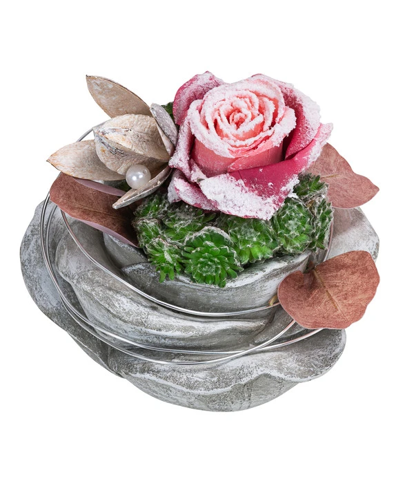Unsere Liebe und Zuneigung können wir auch mit kleinen Gesten wie diesem Grabgesteck wunderbar ausdrücken. Das Trauergesteck und sein Inhalt verbinden viele Symbole zu einer schönen Botschaft, ganz ohne überladene Dekoration. Die künstliche Rose, die wie eingeschneit wirkt, zeigt Ihre Verbundenheit zu den verstorbenen Menschen, während die grüne Hauswurz für Hoffnung steht. Die nie verblühende Rosenblüte kann zudem als Zeichen der Ewigkeit gedeutet werden. Umgeben ist die Kunstblüte von roten Eukalyptus-Blättern und kleinen, liebevoll arrangierten Deko-Elementen. Dank der winterlichen, etwas verspielten Optik und dem haltbaren Material, ist das Grabgesteck Im Himmel eine ideale Grabdekoration und darf lange Zeit die letzte Ruhestätte schmücken.