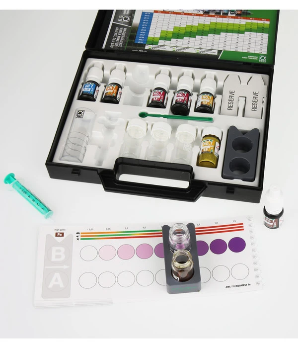 Natürlich ist jeder Aquarianer bestrebt, seinen Aquariumsbewohnern die beste Wasserqualität anzubieten. Wie Sie aber wissen, sind die richtigen Wasserwerte keine festen Größen, sondern hängen vom Fischbesatz und den vorhandenen Pflanzen ab. Deshalb bleibt einem verantwortungsvollen Aquarianer nur eines übrig: immer wieder die Wasserqualität testen. Auch wenn das Wasser klar aussieht, denn es kann trotzdem belastet sein und bei schlechten Werten können Algen oder Krankheiten entstehen. Damit Ihnen diese Tests schnell von der Hand gehen, aber trotzdem sehr genau sind, wurde das JBL Wasseranalyse ProAquaTest® Combiset Plus Fe entwickelt. Mit diesem praktischen Testkit können Sie alle relevanten Wasserwerte schnell und sehr präzise bestimmen. Holen Sie sich deshalb gleich das JBL Wasseranalyse ProAquaTest® Combiset Plus Fe, bei dem jetzt auch die Testmöglichkeit für den Eisengehalt im Wasser enthalten ist!