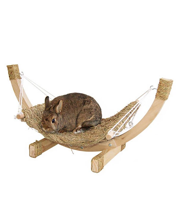 Eine perfekte Ergänzung für den Kaninchenstall oder das Freilaufgehege ist die Kerbl Grashängematte Siesta. Auf diesem tollen Nagerzubehör, bestehend aus einem stabilen Holzständer und einer Hängematte aus Gras, kann ihr Hoppler mal so richtig abhängen. Die Grashängematte bietet dem Kaninchen einen idealen Rückzugsplatz zum Schlafen und Entspannen. Sollte Ihr Kaninchen die schwingende Bewegung der Hängematte nicht mögen, lässt sie sich auch ganz unproblematisch fixieren und so nutzen. Da die Hängematte aus natürlich getrocknetem Gras gefertigt ist, können Sie ganz beruhigt sein, wenn Ihr kleiner Vierbeiner gerne die Matte anknabbert. Frei von gefährlichen Draht- und Kunststoffteilen ist die Grashängematte sogar für den Verzehr geeignet. Das Gestell und die Hängematte sind einfach und schnell montiert, so dass Ihr Kaninchen das bequeme Nagerzubehör schnell in Besitz nehmen kann.