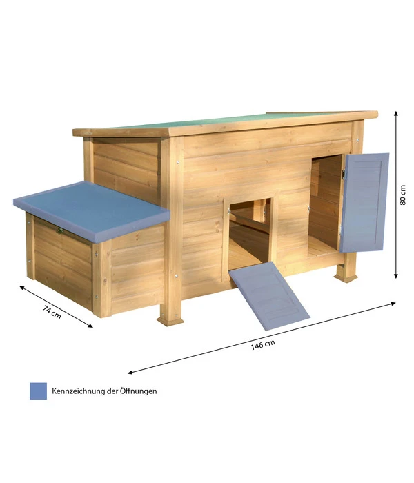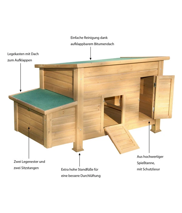 KERBL Hühnerstall Florentina besteht aus hochwertiger Spießtanne, die mit einer Schutzlasur versehen wurde. Neben dem eigentlichen Häuschen hat der Stall einen kleinen Anbau, in dem die Legenester und die Sitzstangen sind. Für die bessere Durchlüftung im Stall sind die Füße der Konstruktion extra hoch, oben sorgt ein Schiebefenster für Frischluft.