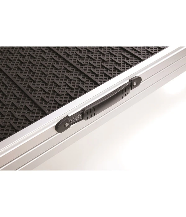 Dank eines stabilen Aluminium- und Kunststoffmixes trägt die Hunderampe Dogwalk XL von kleinmetall® auch schwerere, große Vierbeiner wie Labradore oder Schäferhunde. Sie ersparen sich so das mitunter mühevolle Heben Ihres Gefährten. Damit die Rampe beim Anlehnen an die Stoßstange nicht verrutscht, wurde sie mit Schaumstoff versehen. Dieses Ausstattungsmerkmal dient auch dem Schutz des Autolacks oder Ihrer Möbelstücke. Handgriff und Verschluss werten den Komfort der Rampe auf. Im zusammengeschobenen Zustand lässt sich die Konstruktion leicht verstauen. Gönnen Sie Ihrem Liebling eine qualitätsvolle Einstiegshilfe und besorgen Sie die kleinmetall® Hunderampe Dogwalk XL!