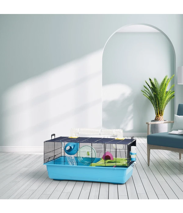 Sie wollen Ihrem Hamster einen Rückzugsort und Abenteuerspielplatz bieten? Dann stellen Sie das Nagerheim Sky Metro von SAVIC in sein Indoor-Freigehege. Das farbenfrohe Spielparadies ist in Ihrer Wohnung auf jeden Fall ein echter Hingucker, der gute Laune macht. Es verfügt über ein Tunnelsystem und eine erhöhte Plattform, die Ihr Liebling ausgiebig erkunden wird. Auch für kletterfreudige Entdecker ist der Käfig ein Ort mit vielen Spielmöglichkeiten. Sollte Ihr Nager nach seinen Abenteuern müde sein, zieht er sich einfach in das Ruhehäuschen zurück, um dort von seinen neuen Abenteuern zu träumen.