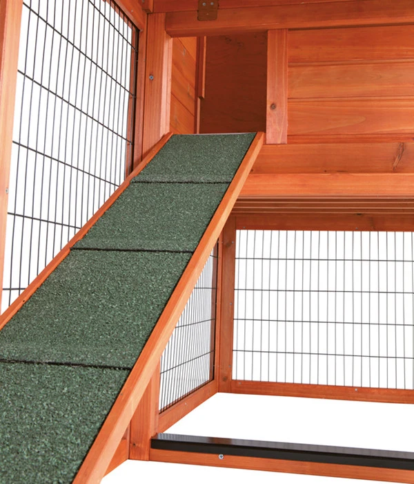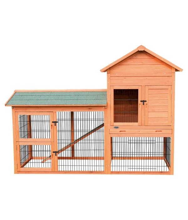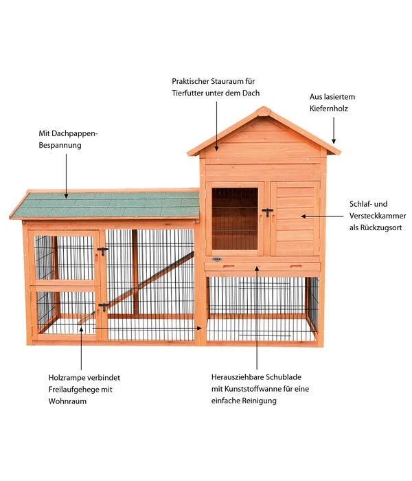 Spielen, Schlafen und Fressen unter einem Dach – für Kaninchen ist das Nagerheim Natura II von Trixie ein Traum. Der große Kaninchenstall bietet ein Freilaufgehege, in dem sich die Tiere auf dem Rasen bewegen können, sowie ein gemütliche Schlafhöhle, die für Kaninchen eine wichtige Rückzugsmöglchkeit darstellt. Der herausnehmbare Schubladenboden sorgt hier für eine komfortable Reinigung. Aus lasiertem Kiefernholz hergestellt und auf dem Dach mit Teerpappe bespannt, ist der Kaninchenstall bestens gegen Witterungseinflüsse geschützt. Unter dem Dach befindet sich zudem ein praktischer Stauraum für Tierfutter o.Ä.. Der Ausgang des Freilaufgeheges liegt ebenerdig, sodass Sie es mit einem zusätzlichen Gehege erweitern können.