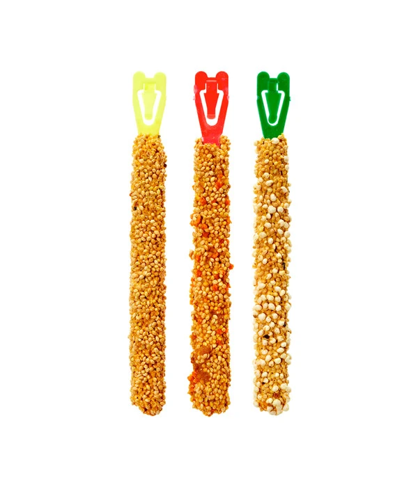 Immer mal was Neues beim Vogelfutter: Drei leckere Kräcker-Sorten für Vögel in einem Pack. Das Vogelfutter von Vitakraft, in den Geschmacksrichtungen Honig, Orange und Popfit, ist abgestimmt auf die Ernährungsgewohnheiten von Wellensittichen und besitzt alle notwendigen Vitamine und Mineralien. Für Vögel ist eine Knabberstange ein wertvoller Zeitvertreib und Futterquelle in einem, denn sie müssen sich das Vogelfutter erarbeiten. Hängen Sie den Körnerstab am mitgelieferten Cliphalter auf.