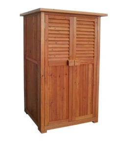 Der Weka Terrassenschrank 195 B präsentiert sich in einem schlichten und natürlichen Look bei dem die Maserung des Holzes gut zu erkennen ist. Dank des unaufdringlichen Designs lässt er sich unkompliziert mit anderen Möbelstücken kombinieren. Die dunkle Holzschutzlasur verleiht ihm nicht nur eine hochwertige Optik, sondern schützt den Schrank auch effektiv vor Witterungseinflüssen. So trotz der Weka Terrassenschrank 195 B Regen und Schnee. Lamellen sorgen für eine gute Belüftung, sodass keine Feuchtigkeit entstehen und sich kein Schimmel bilden kann. Der Schrank steht durch vier breite Füße etwas erhöht, wodurch sich auch dort kein Wasser ansammelt.